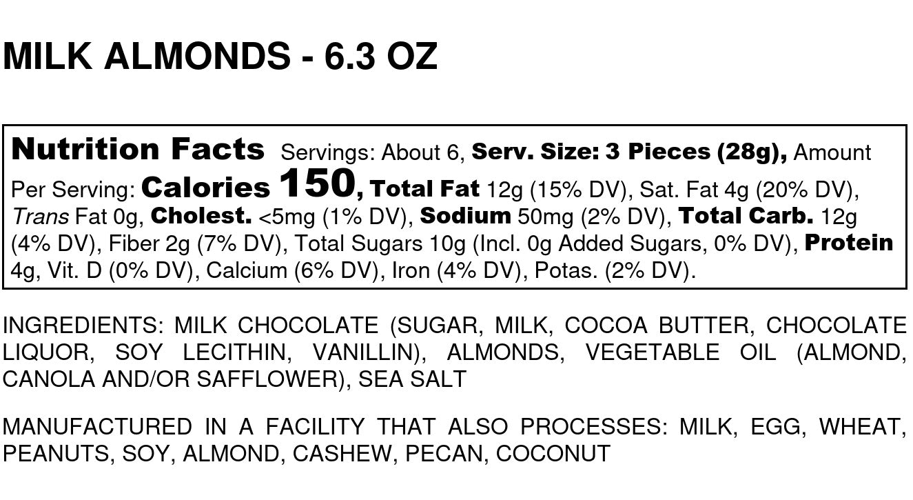 Though our candy shop has grown and embraced new items over the years, we take pride in making our candies in small batches with only the finest ingredients. We start our almond clusters with salted almonds. With those almonds hand-dipped into rich, smooth milk chocolate, this signature flavor combination will surely satisfy your sweet tooth.