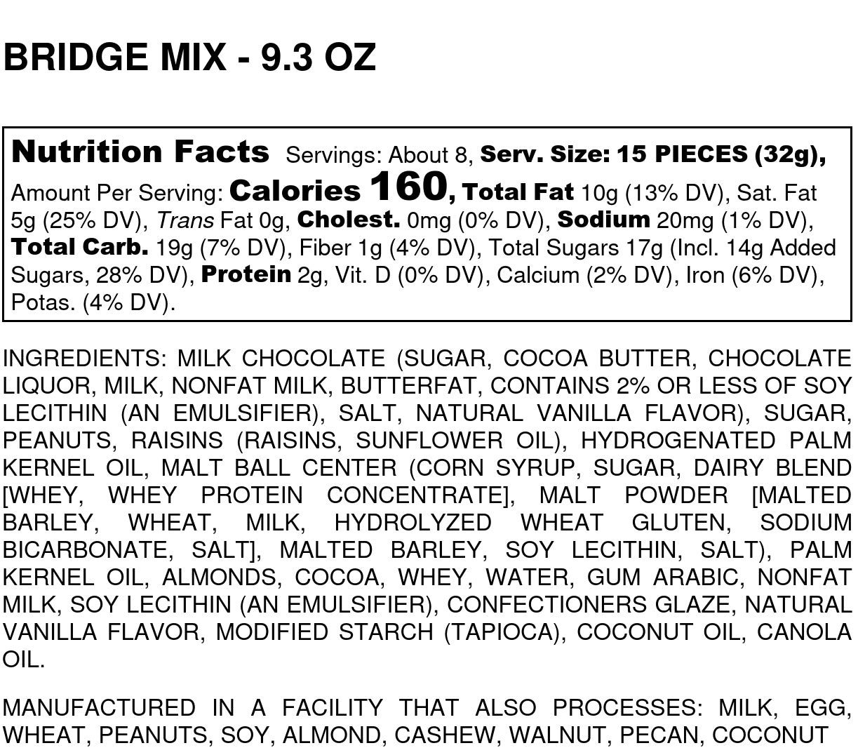 Elevate your snacking experience with our delectable snack-size bag of chocolate-covered bridge mix. Indulge in the delightful medley of flavors and textures that our bridge mix offers. Each bite promises a harmonious fusion of sweetness from the rich chocolate coating and the satisfying crunch of nuts and raisins, creating a tantalizing treat that's hard to resist.