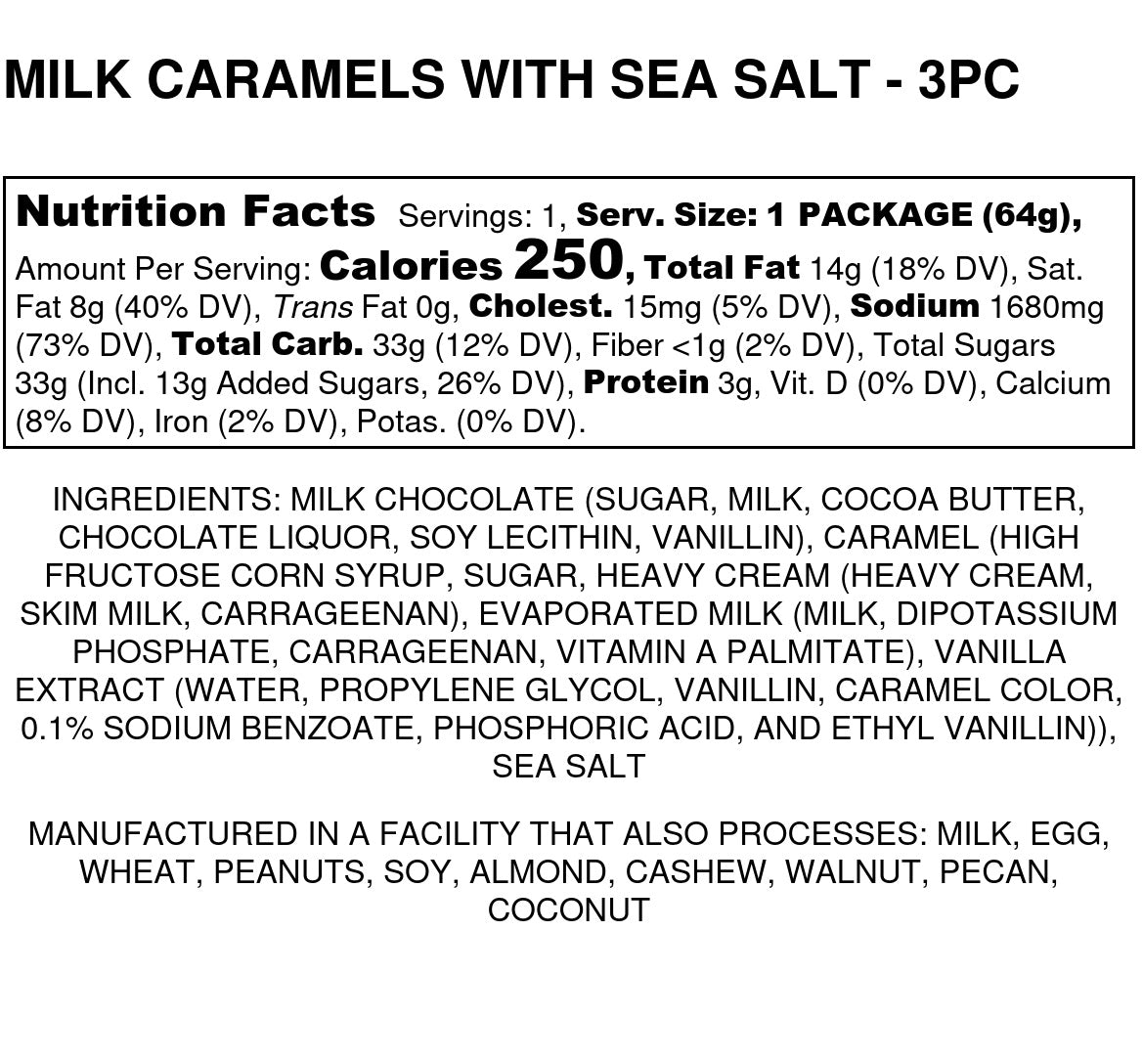 3 pieces of our delicious homemade caramels dipped in creamy milk chocolate and sprinkled with sea salt.