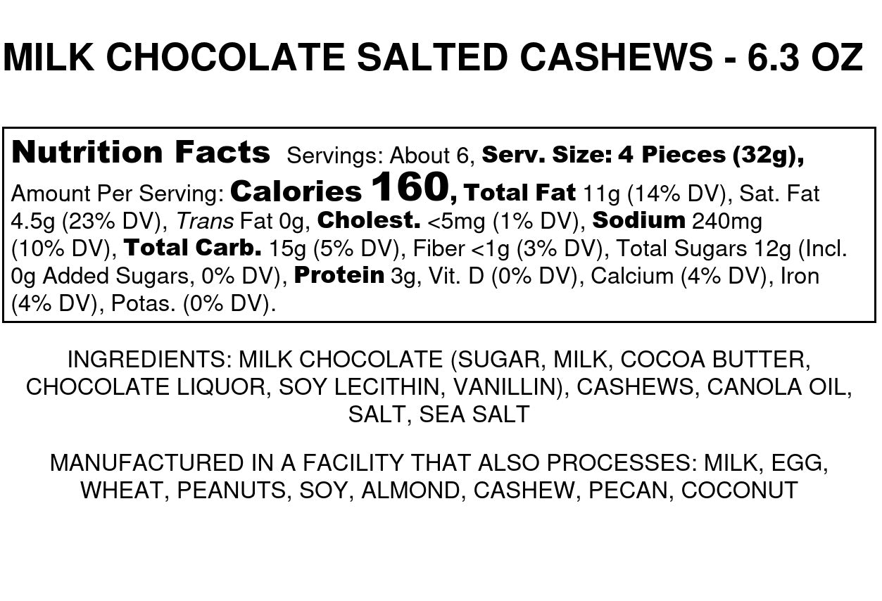 SNACK SIZE BAG OF JUMBO SALTED CASHEWS DIPPED IN MILK CHOCOLATE AND SPRINKLED WITH SEA SALT