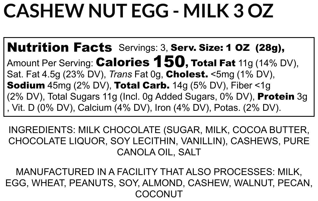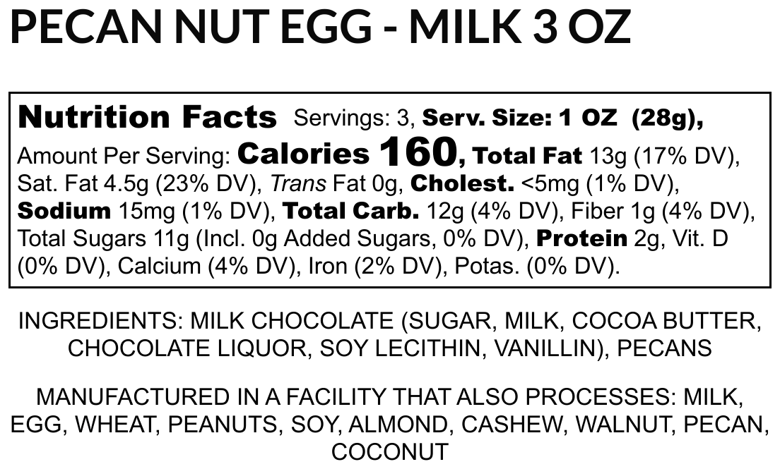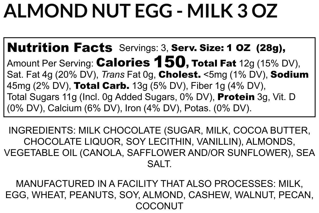 SOLID MILK CHOCOLATE EGG SHAPE LOADED WITH YOUR CHOICE OF NUT. 3 OZ