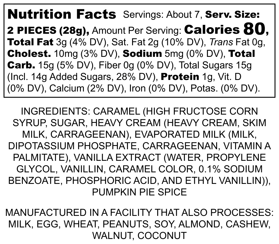 OUR OLD-FASHIONED VANILLA CARAMELS FLAVORED WITH PUMPKIN PIE SPICES WRAPPED IN CELLO FOR A BITE SIZED TREAT