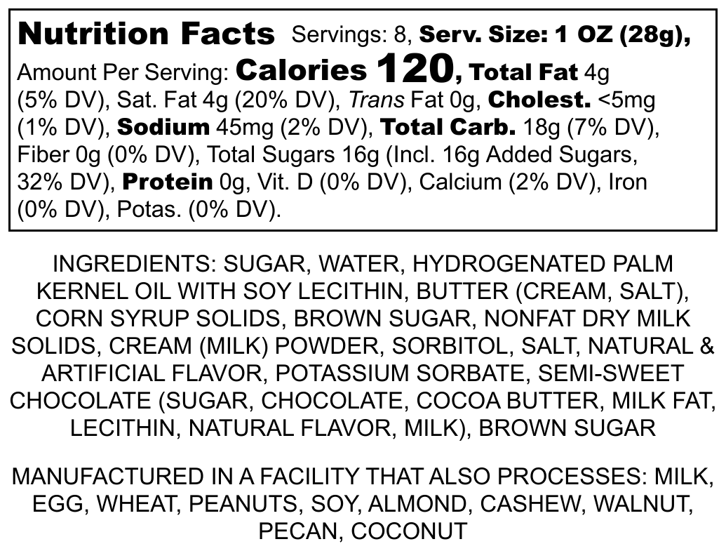half pound of smooth and creamy brown sugar flavored fudge, mixed with mini chocolate chips.