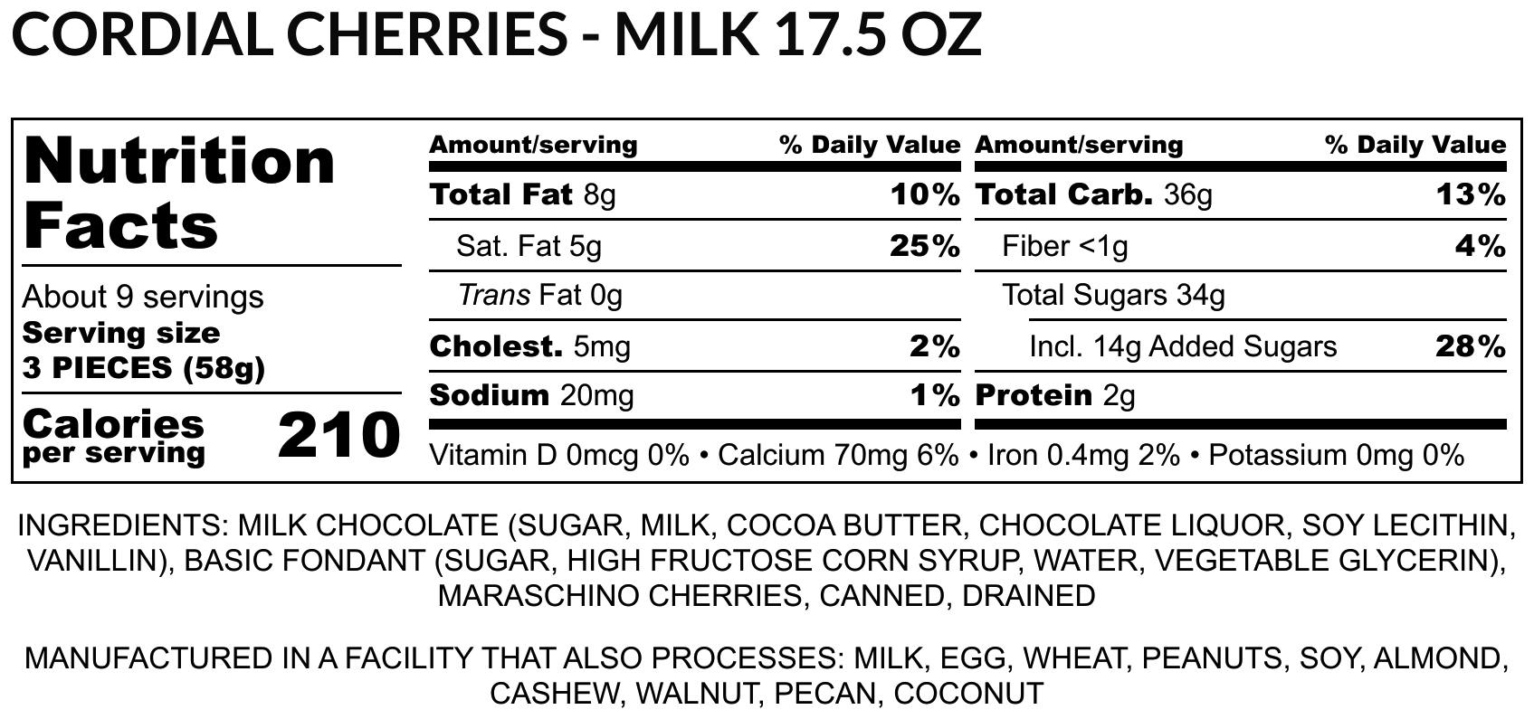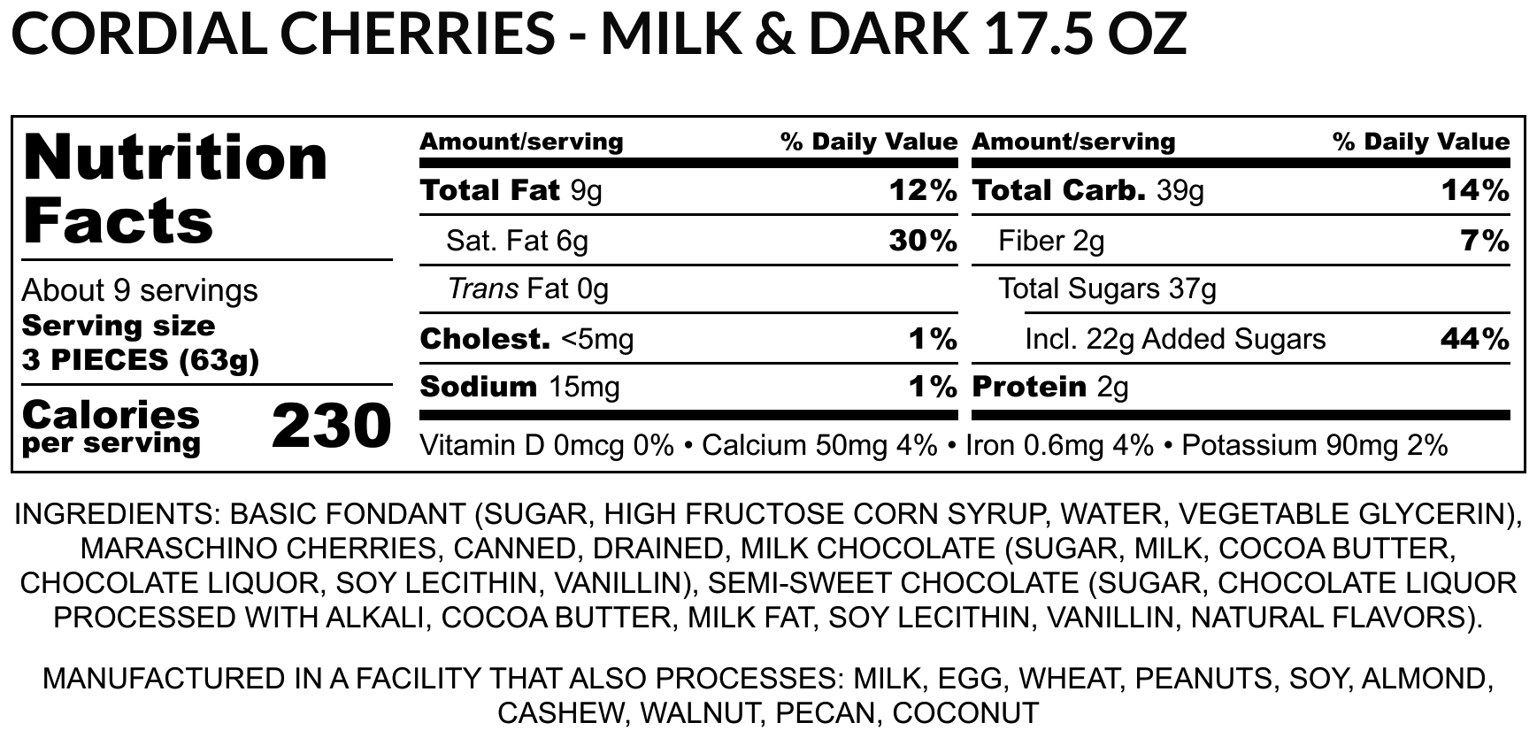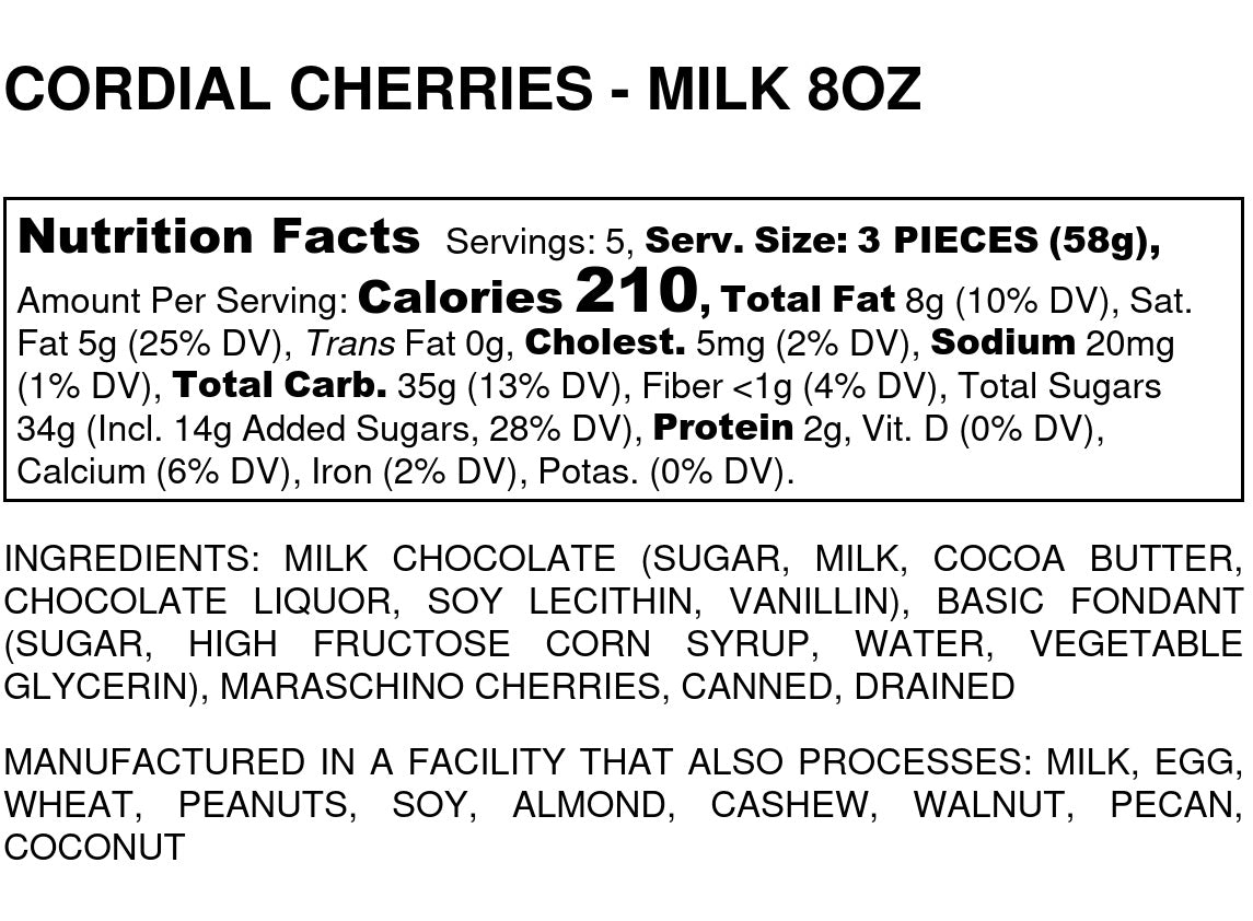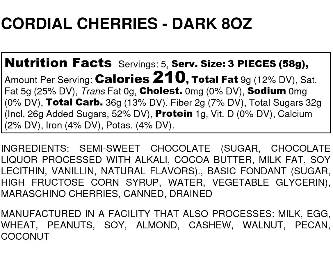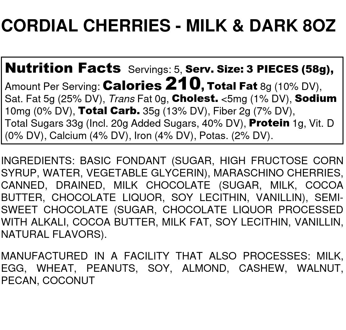 At Bedford Candies, located in Bedford County, PA, we take pride in crafting all our chocolates from scratch using only the finest ingredients. Each maraschino cherry is dipped in a delicate sugar fondant, creating the signature liquid center that bursts with flavor with every bite. Choose between our gourmet milk or dark chocolate coatings to suit your taste preferences. These delectable cordial cherries are available in convenient 8 ounce or 17.5 ounce boxes, perfect for sharing or savoring on your own.