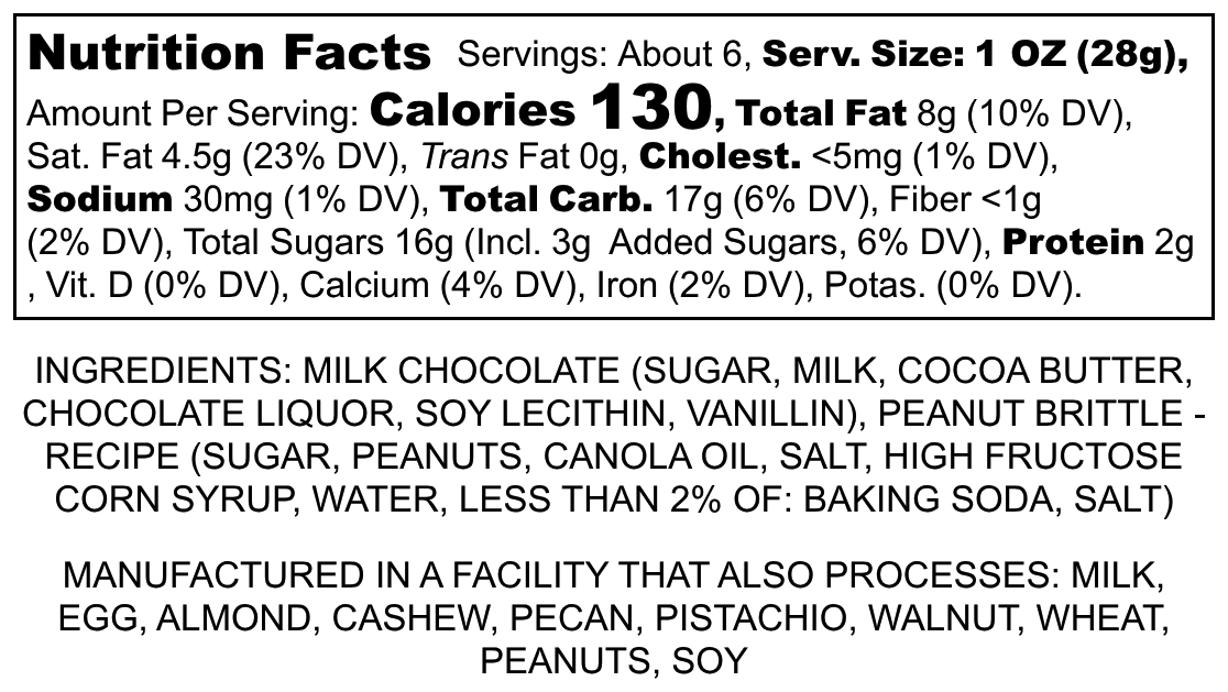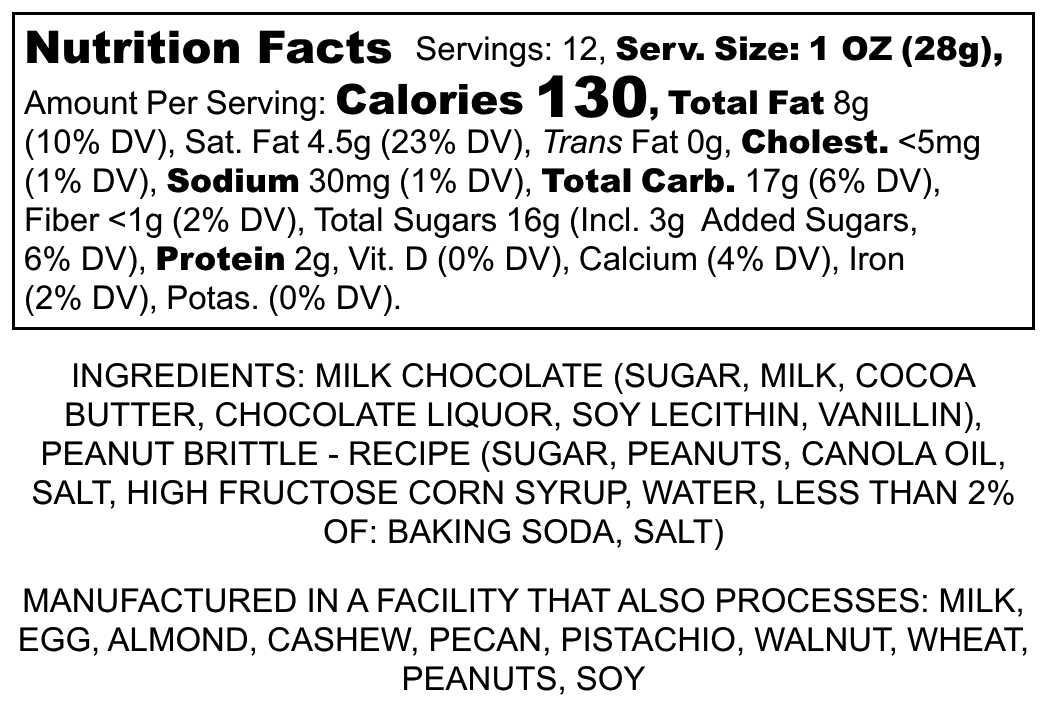 Savor crunchy peanut brittle pieces generously coated in creamy milk chocolate, delivering a perfect balance of sweet and nutty flavors in every bite.