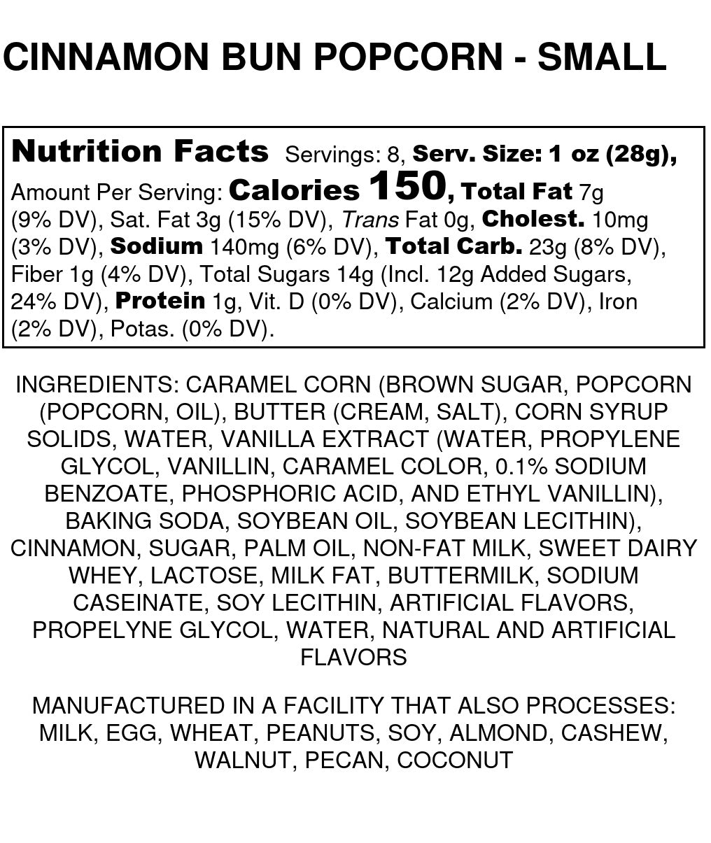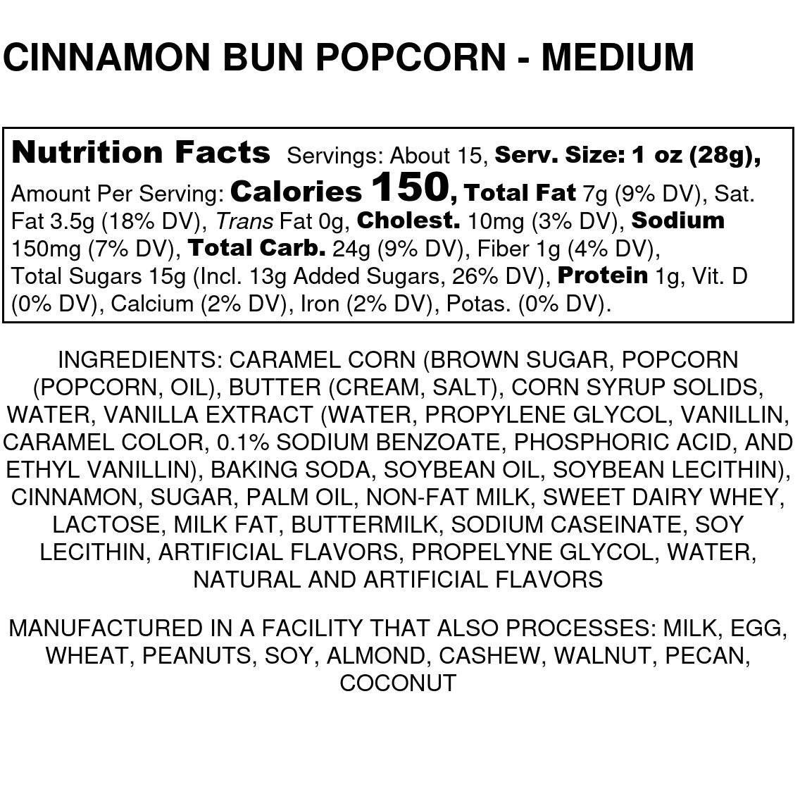 Cinnamon Bun Popcorn OptionsWe make our cinnamon bun popcorn using our gourmet popcorn that we pop in small batches. This ensures that we can carefully monitor the freshness and quality of each batch. To add a layer of sweetness, we coat the popcorn in our homemade cinnamon caramel. To get a cinnamon bun flavor, we add plenty of candy coating with cream cheese flavoring on top.