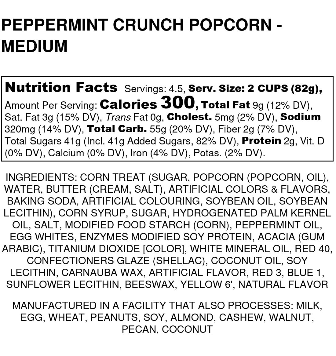 Crunchy candy coated popcorn with a peppermint twist drizzled with dark chocolate and topped with candy cane pieces.
