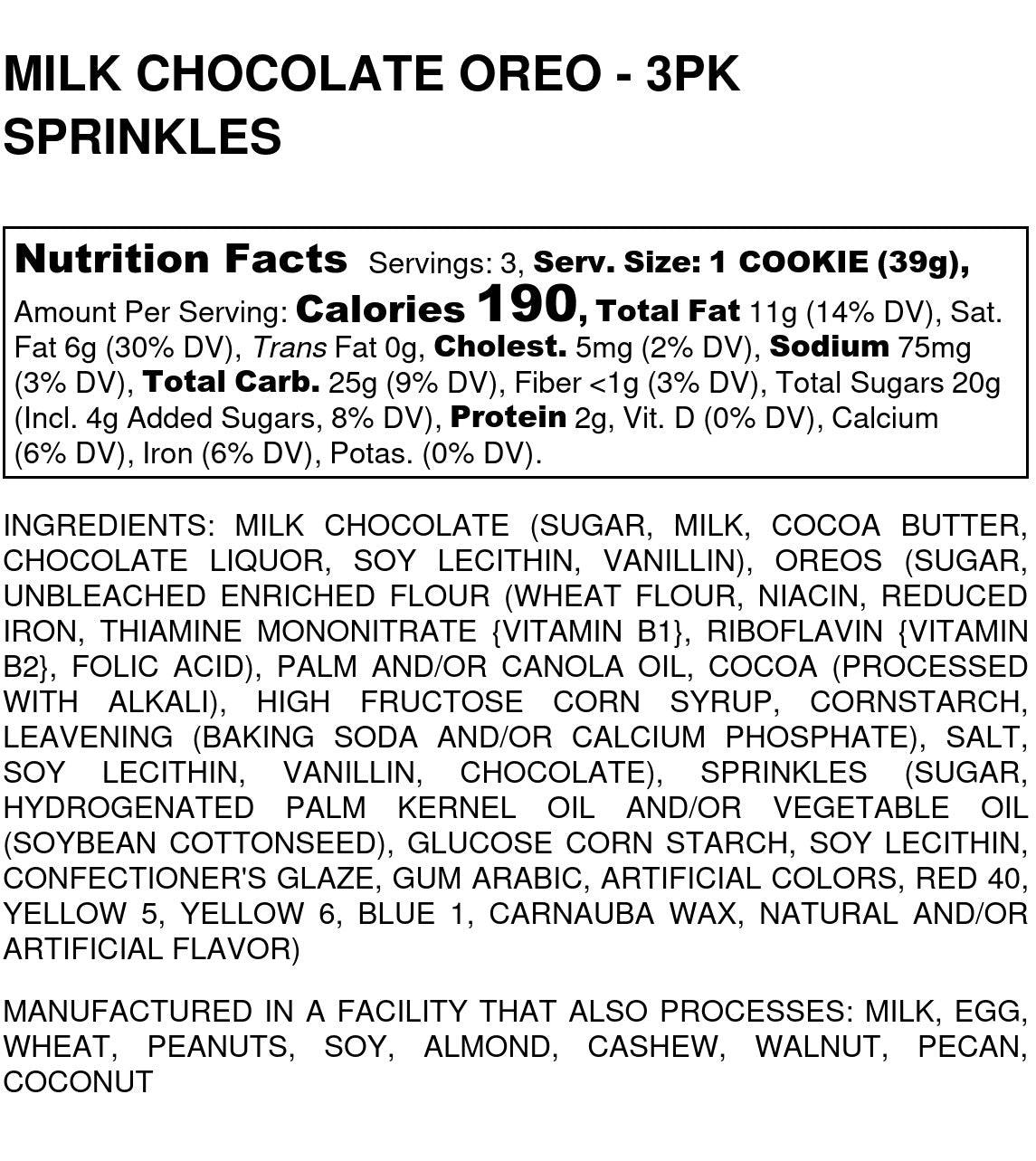 3 Oreo cookies dipped in our gourmet milk chocolate with seasonal sprinkles.