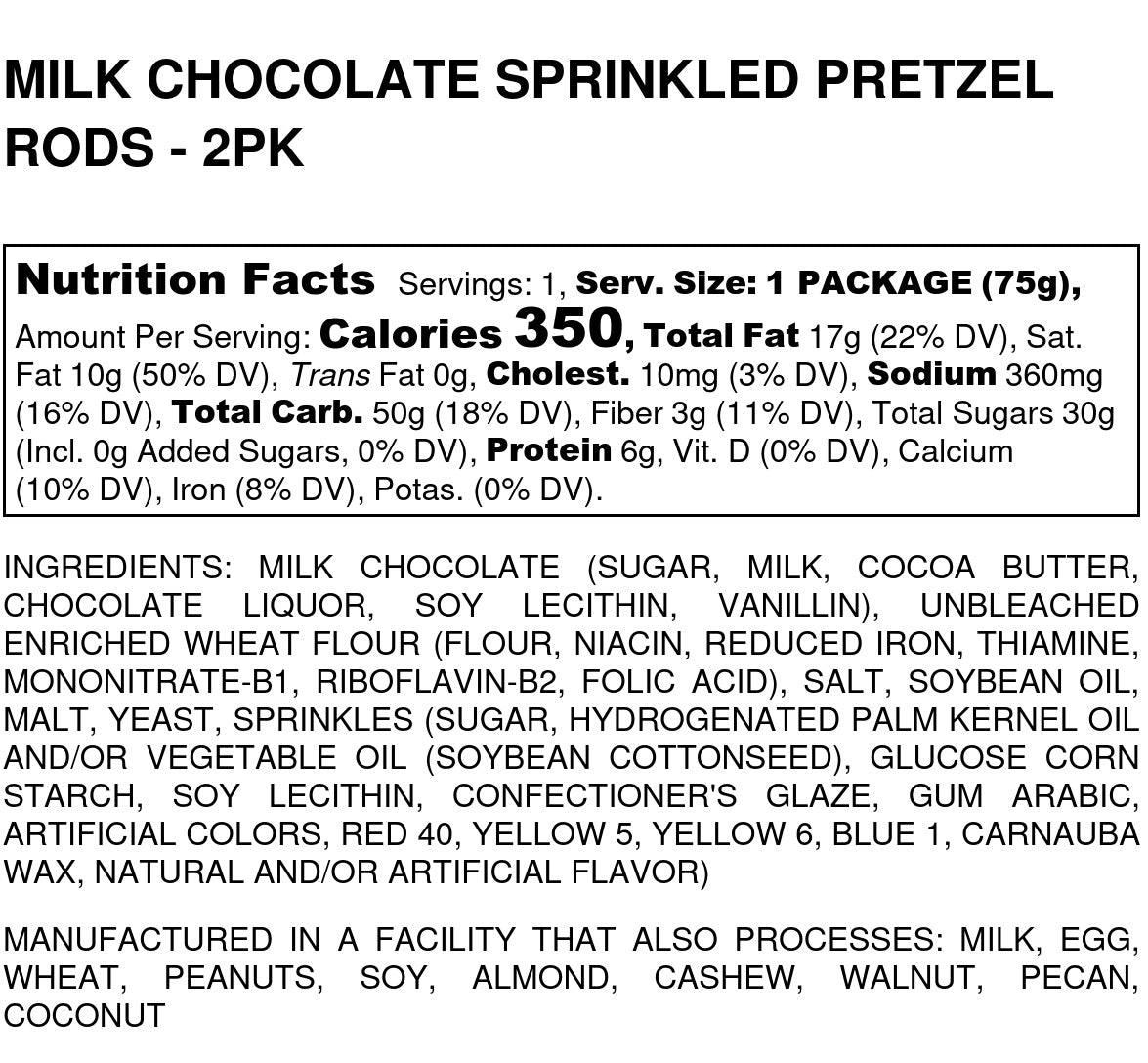 CRUNCHY LONG PRETZEL RODS DIPPED IN MILK CHOCOLATE AND TOPPED WITH RED, WHITE, & BLUE SPRINKLES. 2 PACK