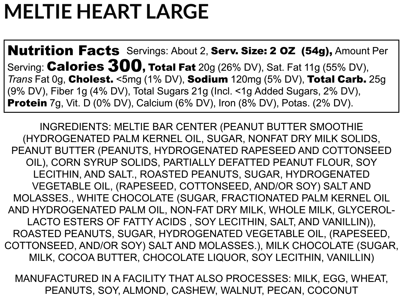 HEART SHAPED; SMOOTH CREAMY PEANUT BUTTER MELTIE CENTER COATED IN GOURMET MILK CHOCOLATE. 3.75oz