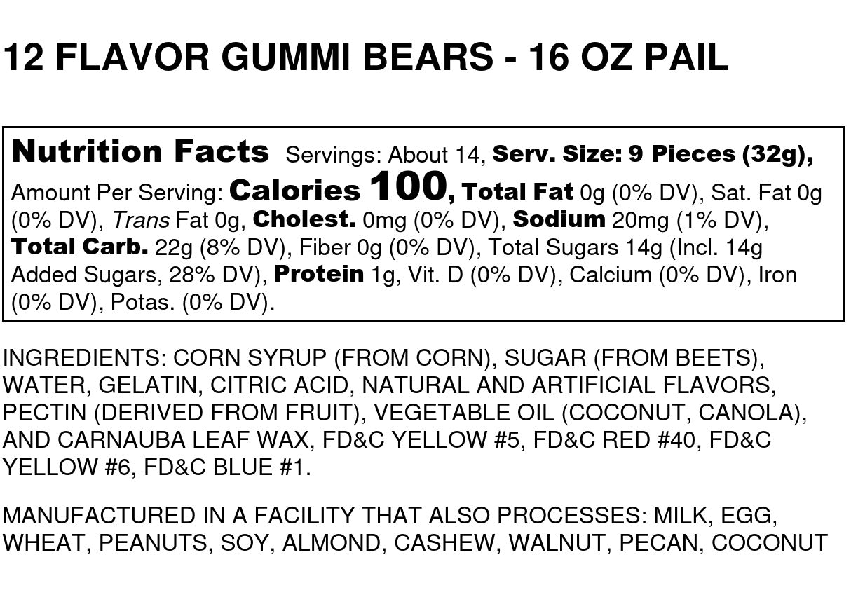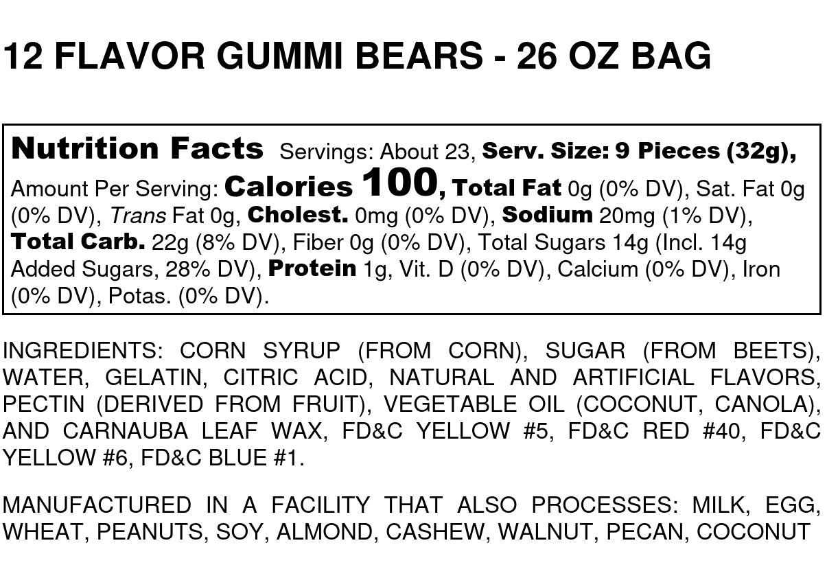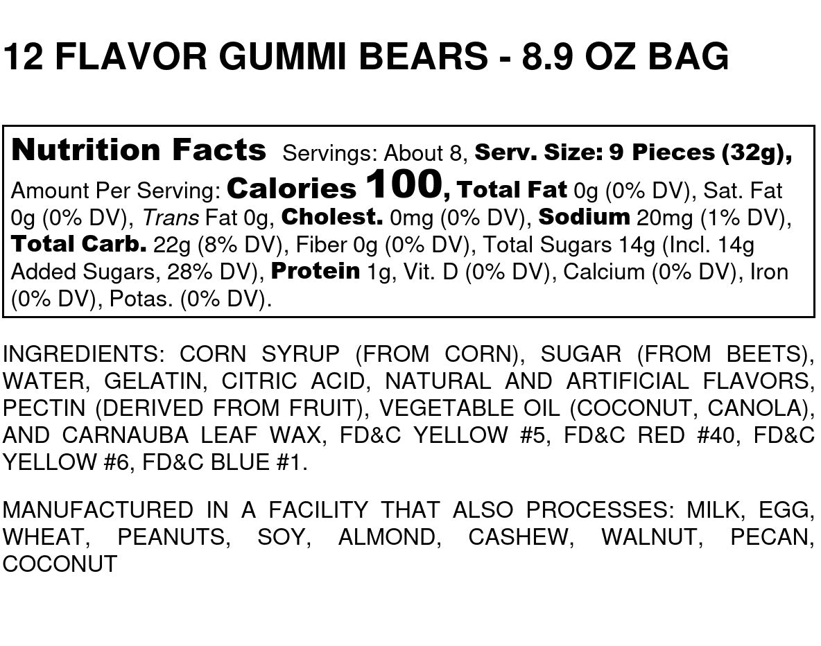 12 flavor gummi bears in a resealable bag. Flavors include: Cherry, Pink Grapefruit, Watermelon, Strawberry, Orange, Blue Raspberry, Lime, Grape, Green Apple, Mango, Pineapple, and Lemon.