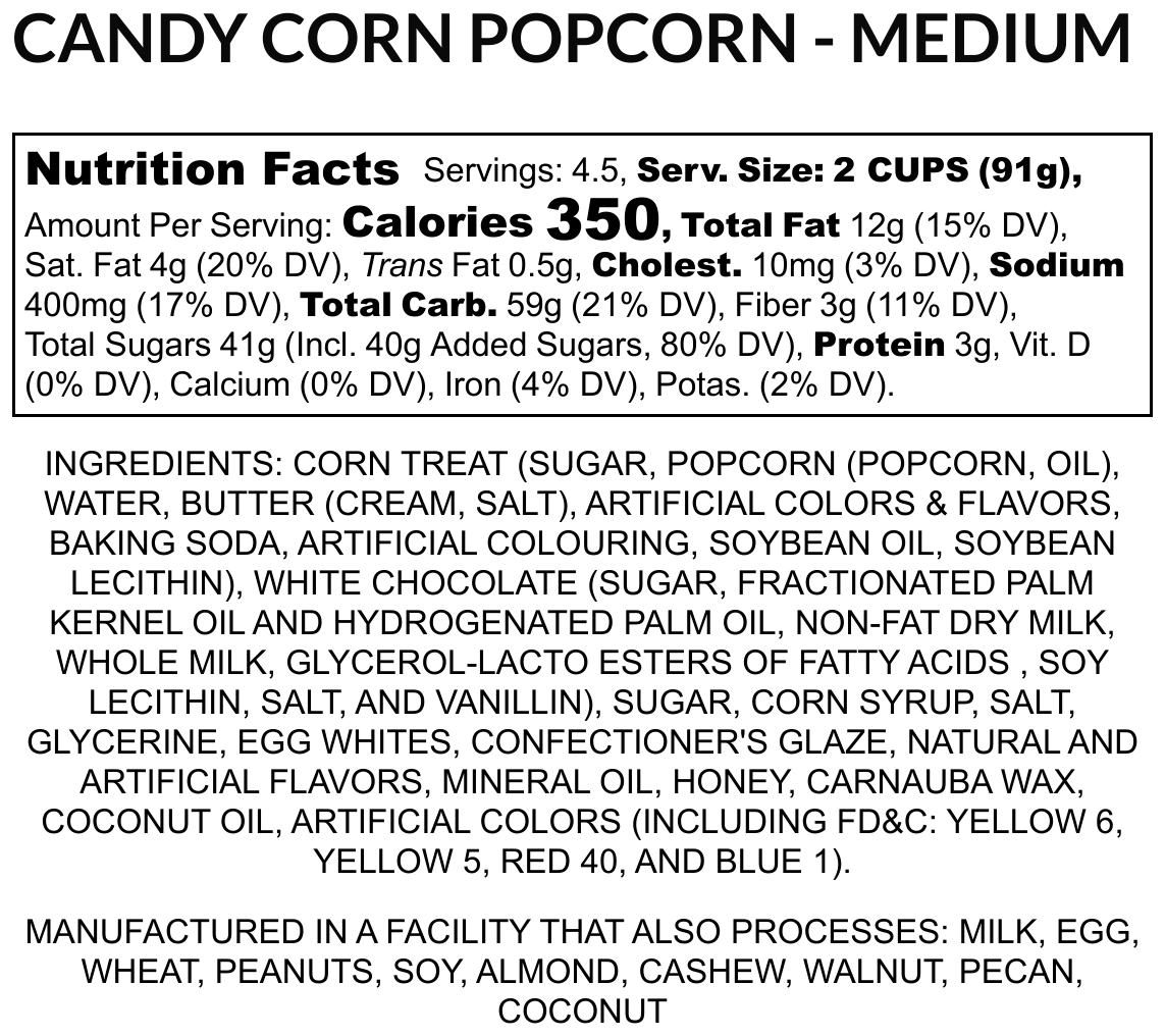 Get into the Halloween spirit with our Candy Corn Gourmet Popcorn, a festive treat crafted just for the season. This specialty popcorn features sweet vanilla-flavored kernels, coated in a candy shell that offers a perfect balance of crunch and sweetness. We add real candy corn pieces for a classic Halloween touch and finish it all with decadent white chocolate drizzles that melt in your mouth. Whether you're hosting a spooky party, searching for a fun snack, or looking for a unique gift, this popcorn delivers a deliciously festive experience that captures the magic of Halloween in every bite.