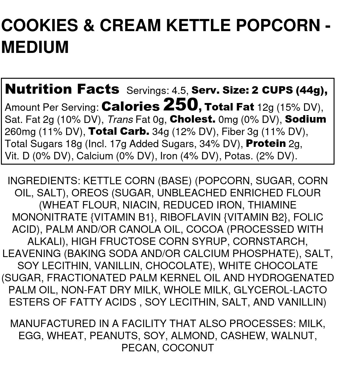 Indulge in the perfect balance of sweet and salty with our Cookies & Cream Gourmet Popcorn. Each bite delivers classic kettle corn drizzled generously with creamy white chocolate, creating a rich, velvety taste. Finished with crunchy, authentic OREO cookie pieces, this snack offers a satisfying texture contrast that keeps you coming back for more.