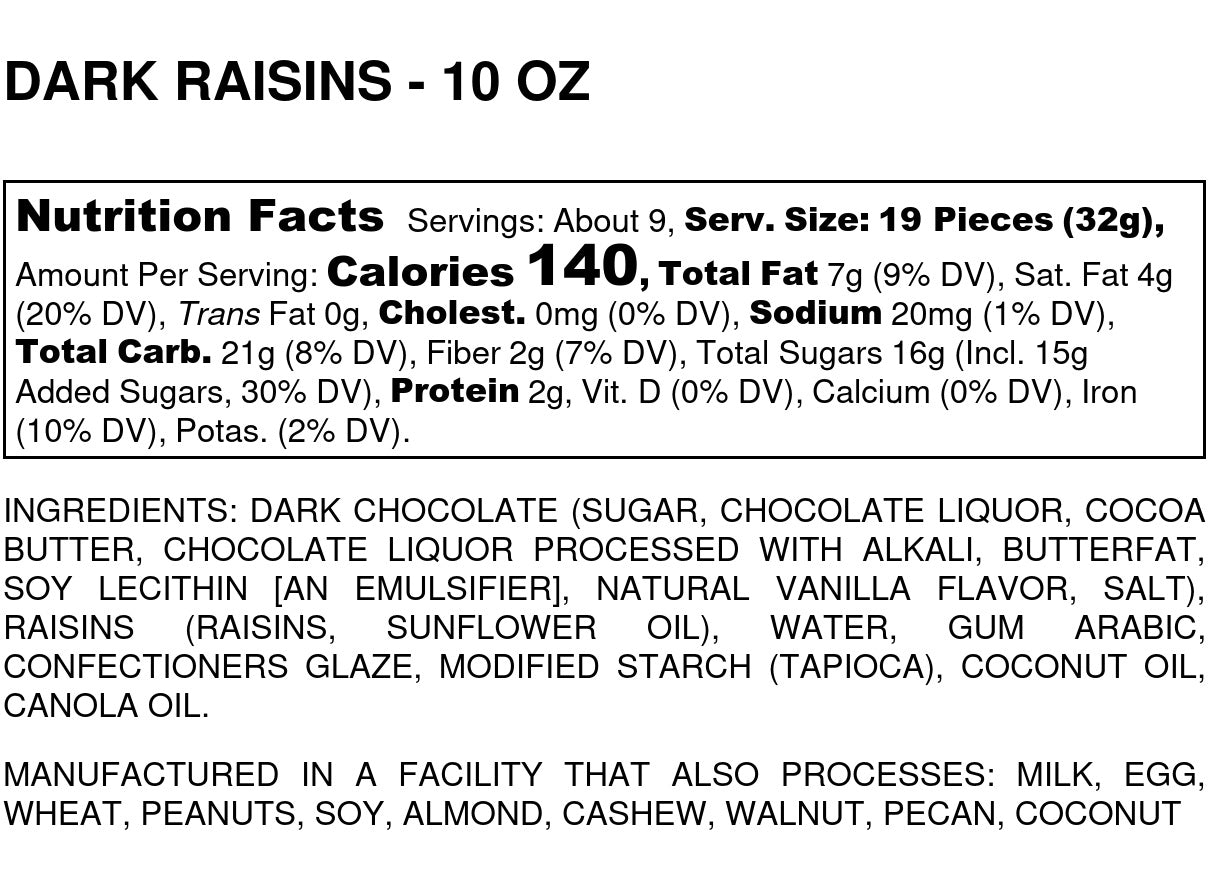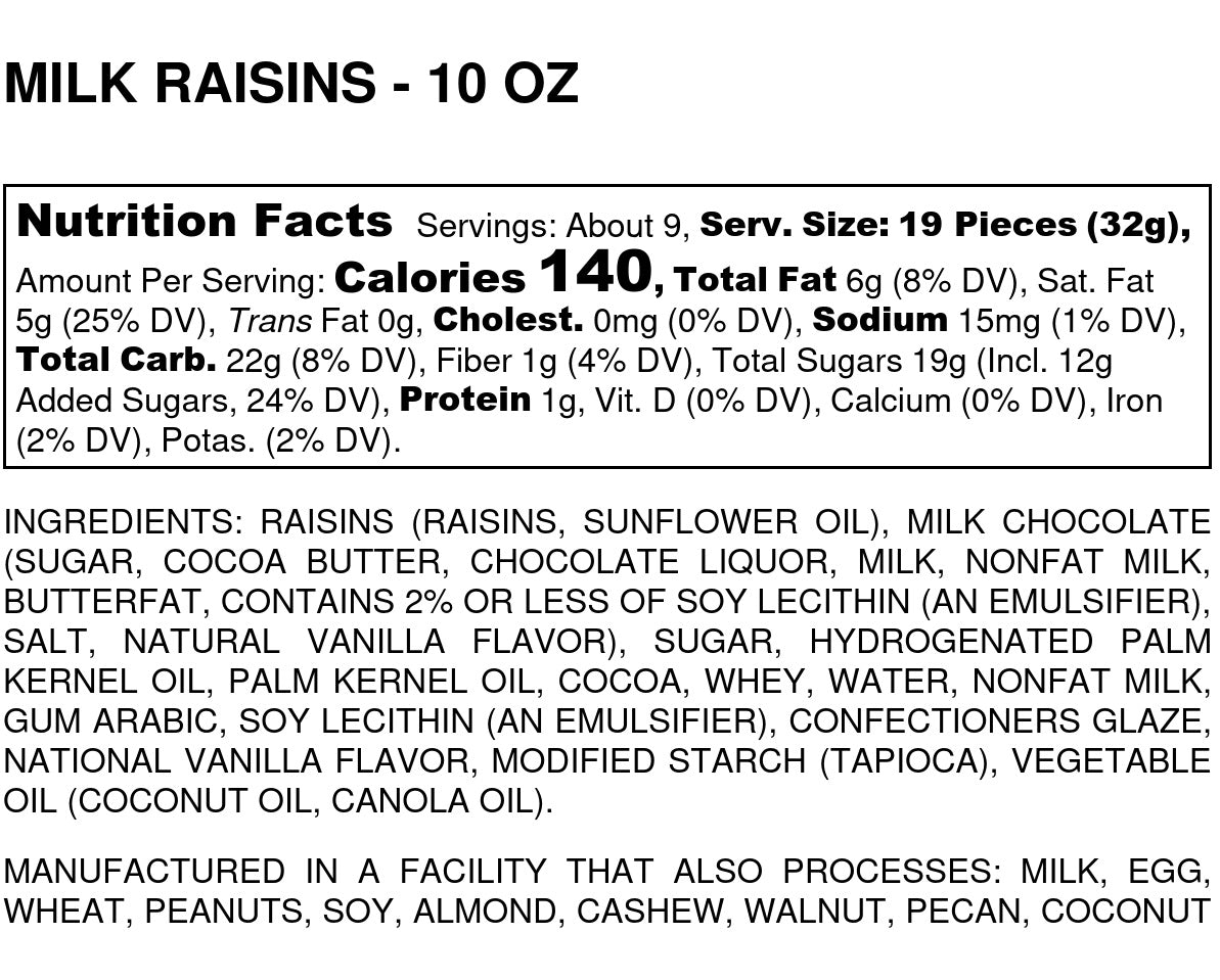 Our snack size bag of chocolate covered raisins comes in a resealable 10-ounce bag, making it convenient for on-the-go snacking or sharing with loved ones. Whether you're enjoying them at home, at work, or on a picnic, these treats are sure to please.