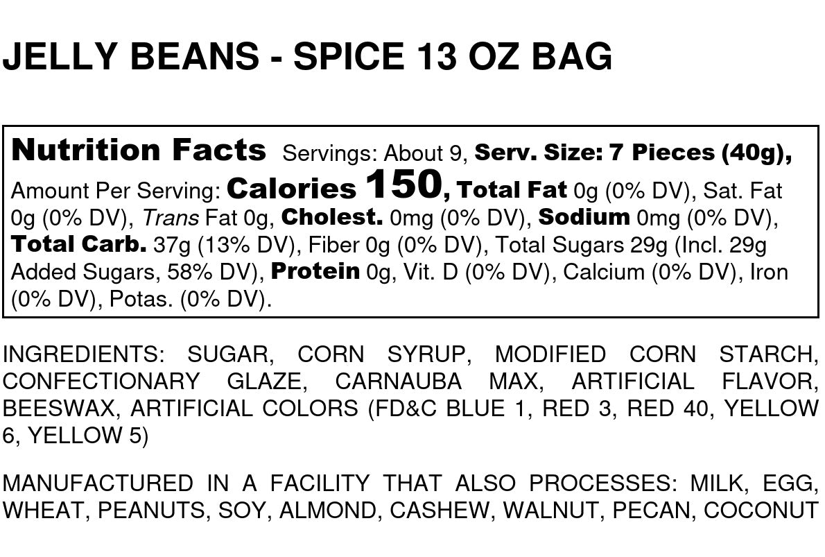 JUMBO SIZE SPICE JELLY BEANS. 13 OZ RESEALABLE BAG. FLAVOR ASSORTMENT OF BLACK ANISE, YELLOW SASSAFRAS, PINK PEPPERMINT, ORANGE CLOVE, RED CINNAMON, WHITE WINTERGREEN, AND GREEN SPEARMINT.